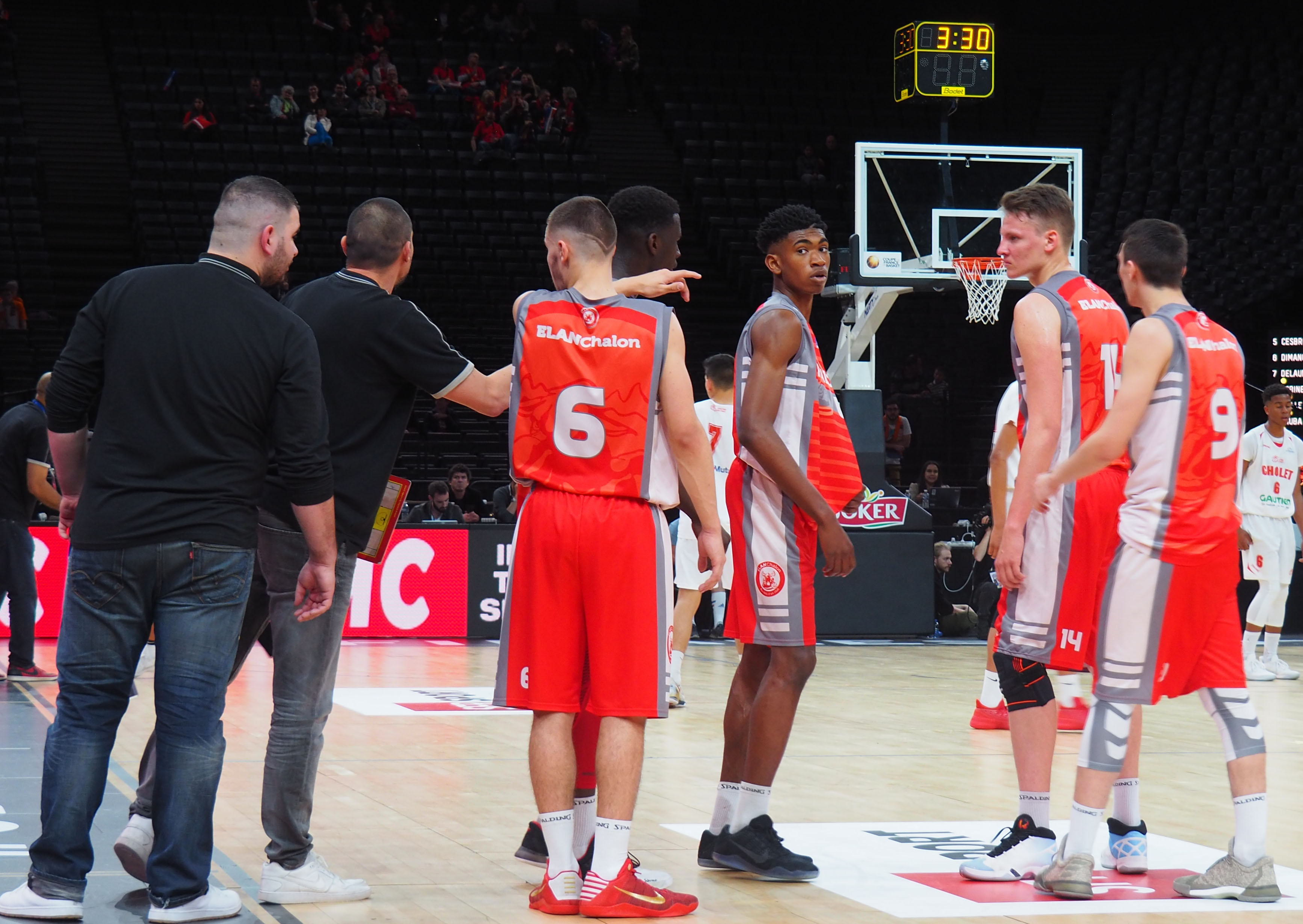 Pourtant lors des 2ème et 3ème quart temps, chalonnais et choletais ont fait jeu égal (21-19 et 19-18) avec notamment un grand Théo Jouvin qui finira la rencontre à 22 pts (à 8/14) et un Mateo Landry auteur d’une belle claquette dunk dès l’entame de la seconde mi-temps. Mais avec un net déficit de taille dans la raquette et la perte de Tom Caillard sur blessure, la bataille au rebond était impossible à gagner. Ajoutez à cela une belle équipe de Cholet assez adroite et un 4ème quart temps où L’ELAN prend beaucoup de risque pour remonter au tableau d’affichage (17-7 en faveur de Cholet) et le match se termine sur ce score lourd de 82-50.